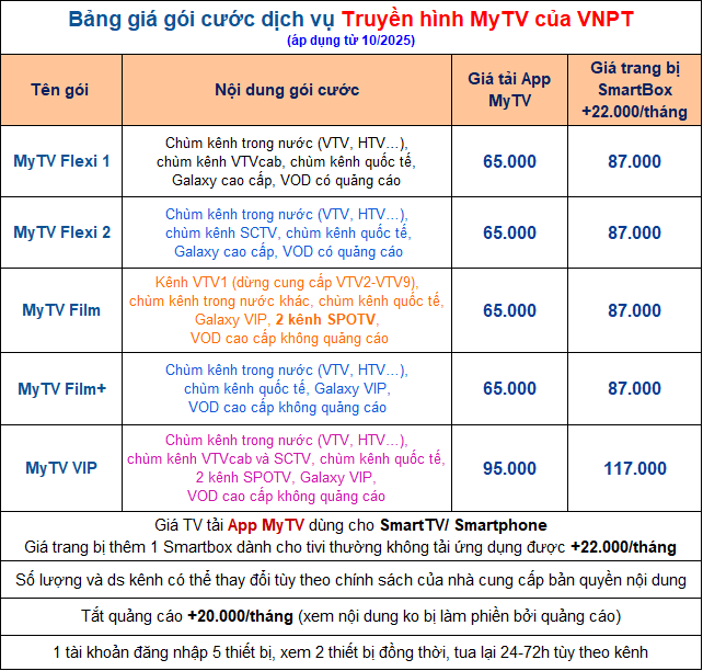 7. Bảng giá gói cước truyền hình MyTV VNPT chi tiết: